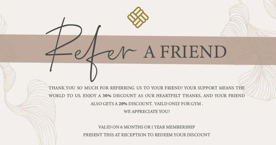 Enjoy a 30% discount valid for 6 months and 1 year gym memberships and your friend can enjoy 20% discount on the same.